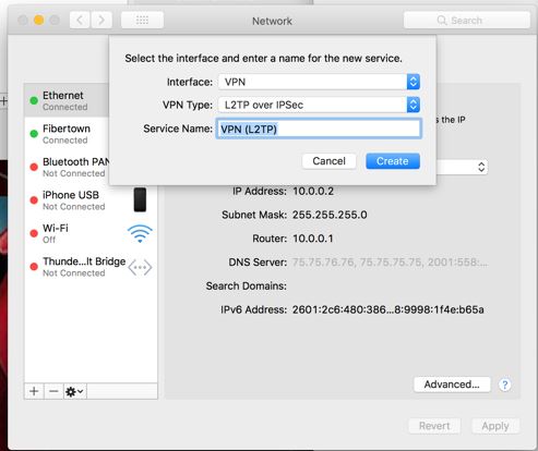 For the interface drop-down, choose VPN, for the VPN Type choose L2TP over IPSEC. Leave the service name as VPN (L2TP), then click create.